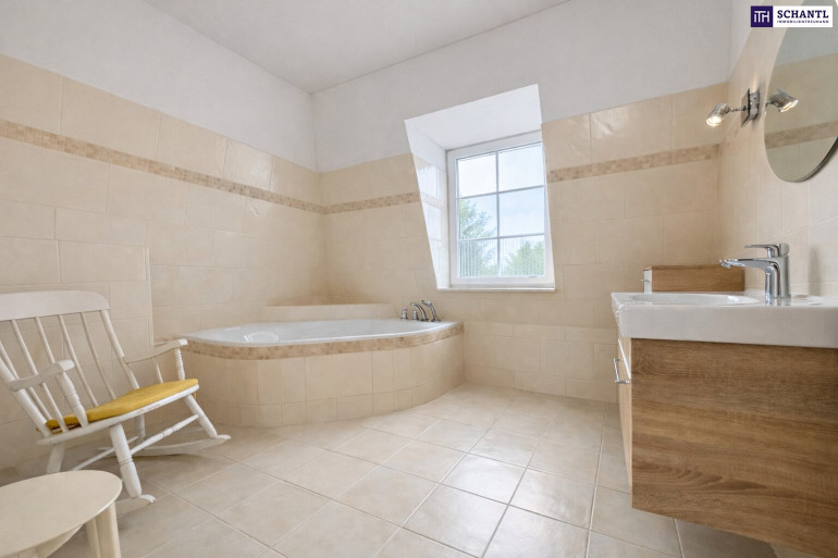 - Komfortables Badezimmer mit Badewanne, Dusche, Doppelwaschbecken und Fenster – hell, freundlich und ein Ort zum Wohlfühlen.