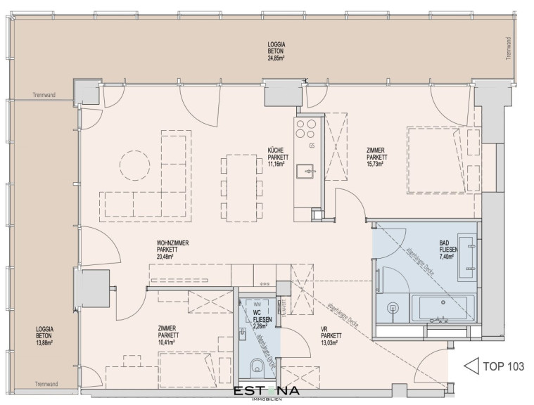 Parkett, Fliesen, Einbauküche, Personenaufzug, Badewanne, Dusche