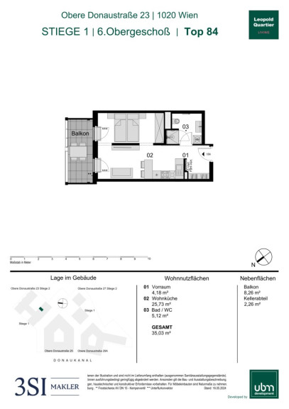 Diese moderne Wohnung befindet sich im 6. Obergeschoß. Die Einheit verfügt über eine Wohnnutzfläche von ca. 35 m² und bietet zusätzlich einen ca. 8 m² großen Balkon.