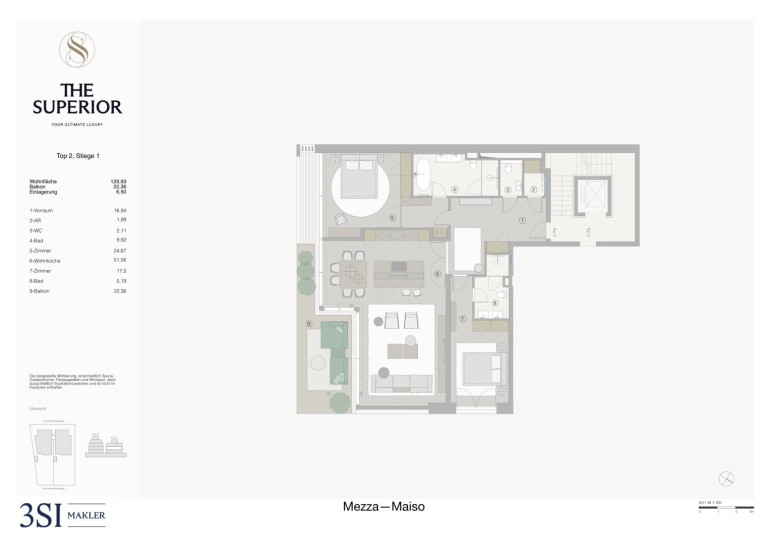 Im Zusammenspiel klarer Linien und präzise gesetzter Details entsteht die architektonische Qualität von THE SUPERIOR. Jede Entscheidung folgt einem übergeordneten Prinzip: Reduktion, Dauerhaftigkeit und Materialität. Die Innenräume überzeugen durch sorgfältig ausgewählte Oberflächen, die Ruhe ausstrahlen und zugleich Tiefe entwickeln. Eichenparkett bringt natürliche Wärme in die Räume, während großformatige Verglasungen Licht und Weitblick selbstverständlich integrieren. Auch in den Bädern setzt sich diese Klarheit fort. Hochwertiges Feinsteinzeug trifft auf fein ausgeführte Sanitärobjekte und schafft eine Atmosphäre, die zurückhaltend und zugleich anspruchsvoll wirkt. Technik versteht sich hier als diskrete Unterstützung. Split-Kühlgeräte sorgen für angenehme Temperaturen, ohne in Erscheinung zu treten. Elektrisch gesteuerte Beschattungselemente regulieren Licht und Atmosphäre im Hintergrund, während die Video-Gegensprechanlage Sicherheit und Privatsphäre gewährleistet.