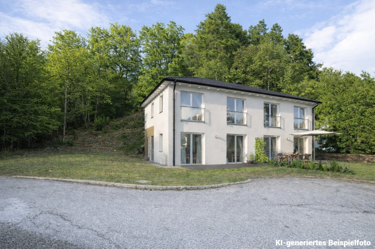 INFO: Bei den Fotos mit dem Haus handelt es sich um KI-generierte Beispielfotos und bei den Innenfotos handelt es sich nur um Einrichtungsbeispiele.