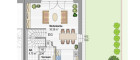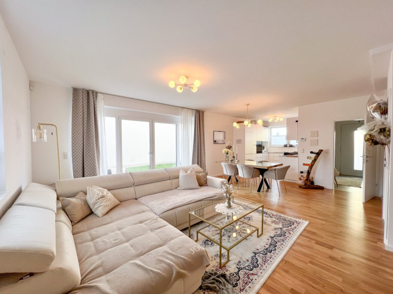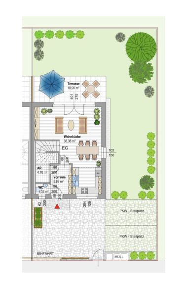 - eine 38,38 m2 große Wohnküche mit Ausgang zur 18 m2 Terrasse und zum Garten