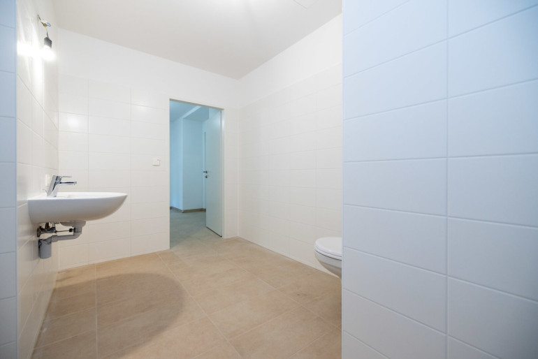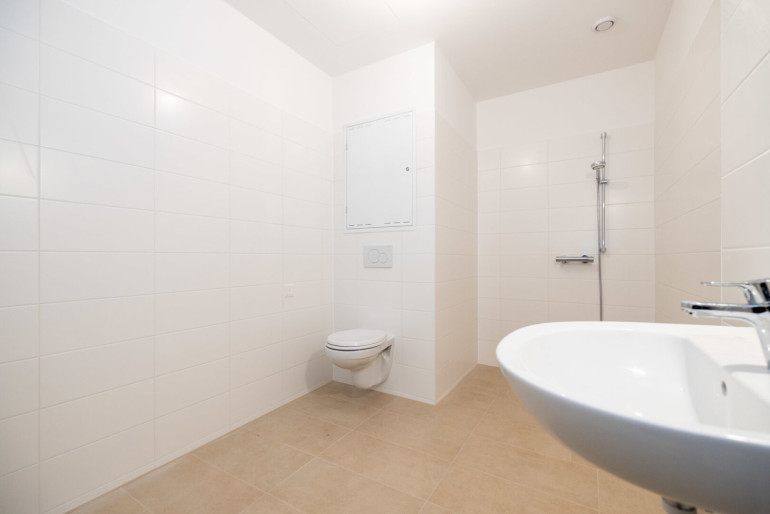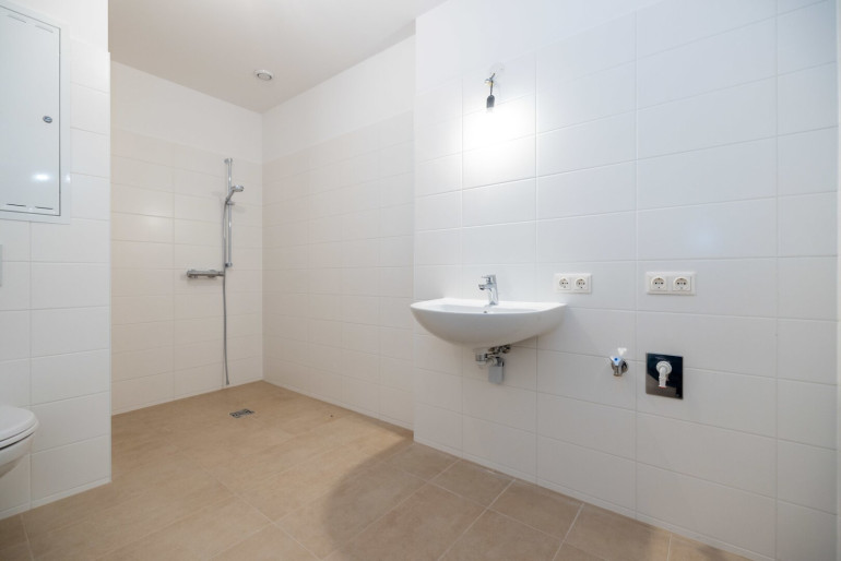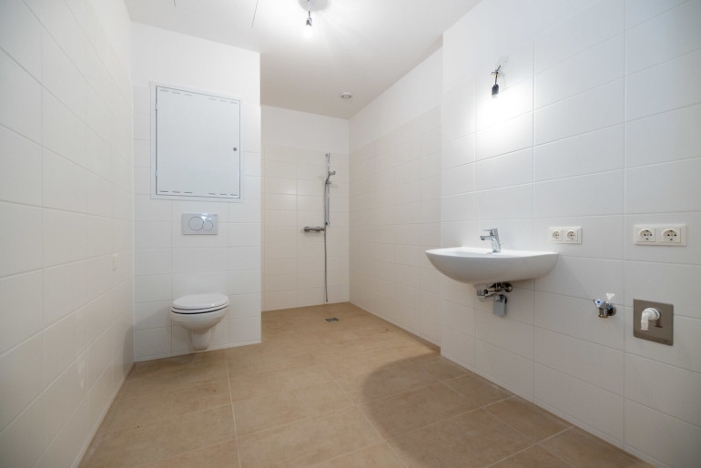 Das modern ausgestattete Badezimmer verfügt über eine bodenebene Dusche, ein Waschbecken sowie ein WC und ist optimal auf komfortables Wohnen abgestimmt. Eine Fußbodenheizung sorgt in der gesamten Wohnung für angenehme Wärme.