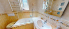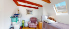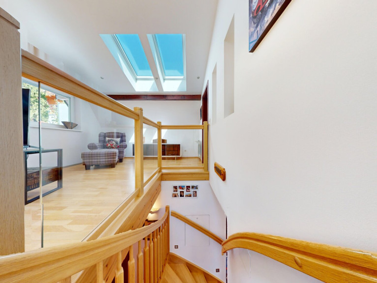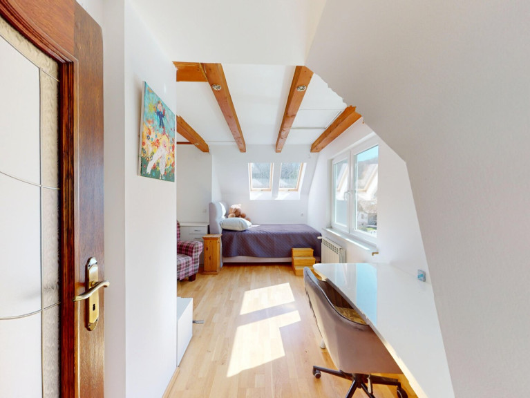 Obergeschoß: Ein großes Schlafzimmer mit angeschlossenem Bad (mit Dusche und WC) und Balkon, ein weiteres, etwas kleineres Schlafzimmer und ein zweiter Wohnraum / TV Zimmer (als Schlafzimmer nicht geeignet, da Durchgangszimmer), Ausgang zur großen, westseitigen Terrasse