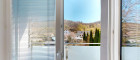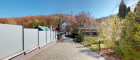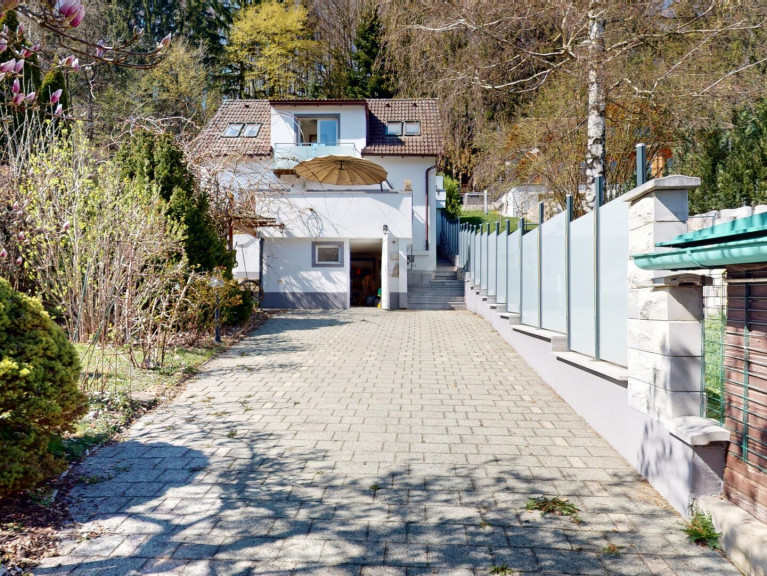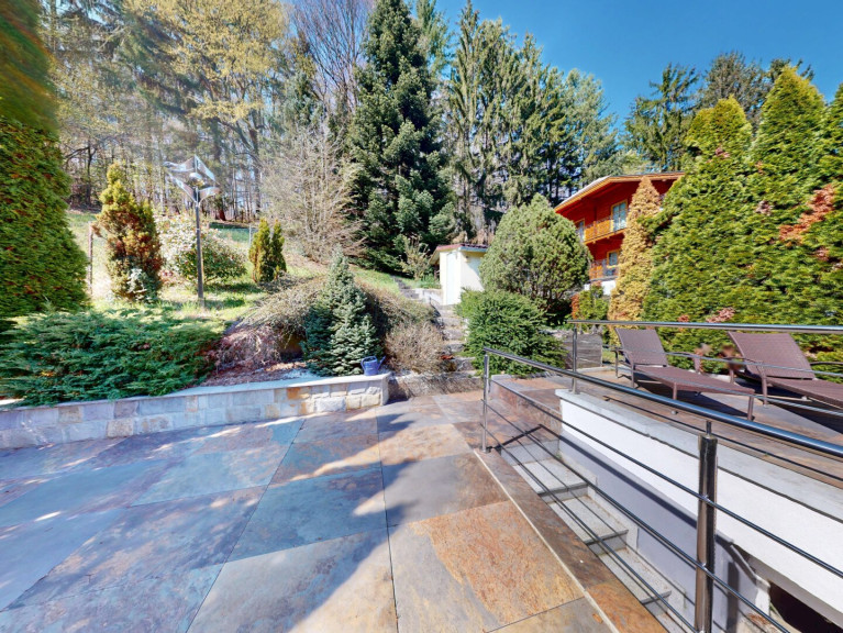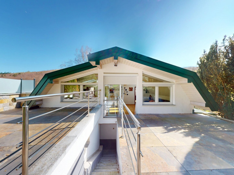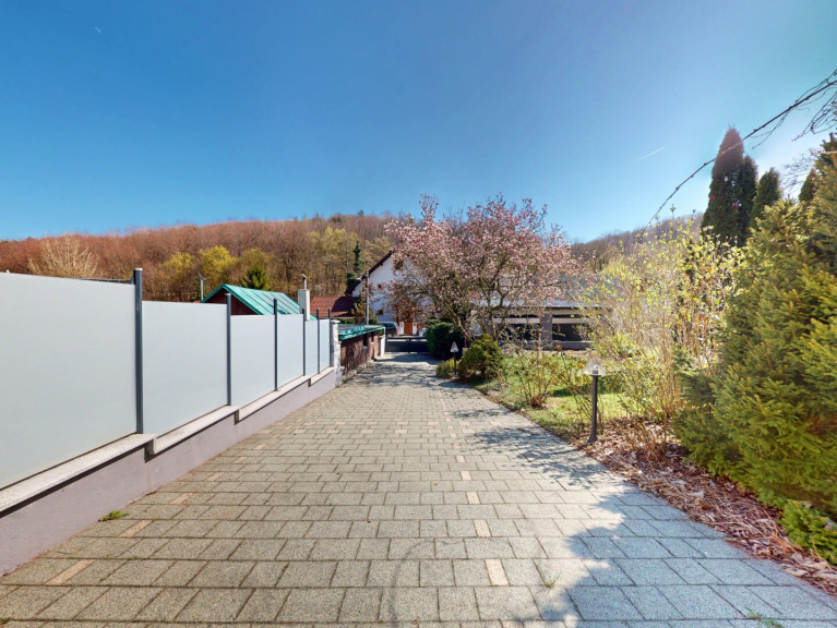 - Großer, ebener Vorgarten, hinter dem Haus Grünfläche in Hanglage mit Bewaldung