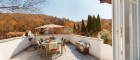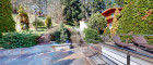 Hinter dem Haus befindet sich die große Sonnenterrasse mit Platz zum Relaxen und Blick in den Grünbereich mit Sträuchern und Bäumen.