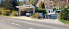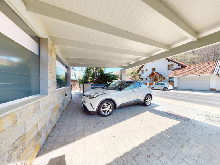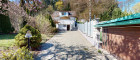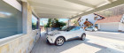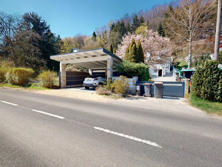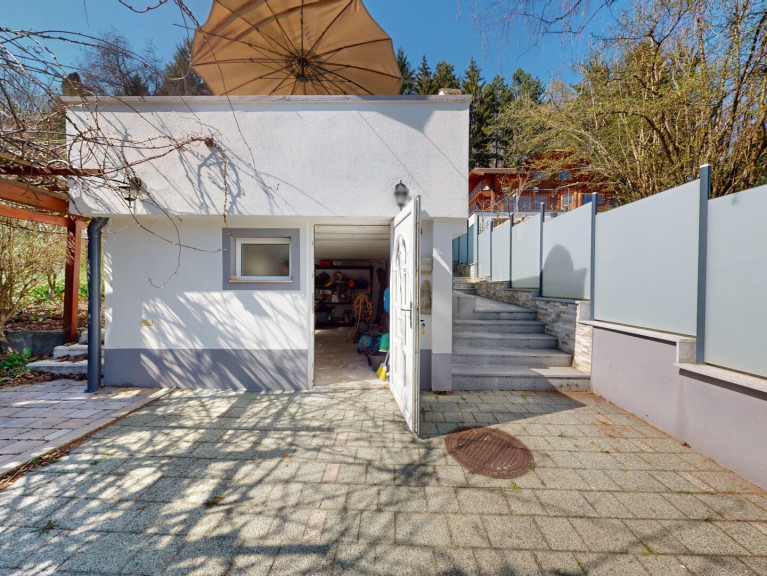Neben dem Eingang zum Grundstück befindet sich ein Carport für zwei Autos. Von hier führt ein gepflasterter Weg – bzw. eine Zufahrt – hinauf zum Haus, vorbei am ersten von zwei Lagerräumen, der sich ebenerdig unter der vorderen Terrasse befindet.