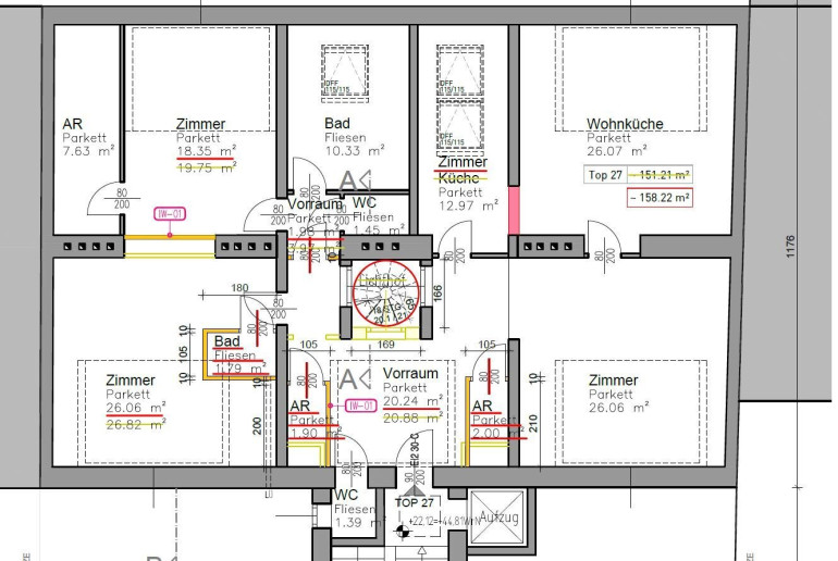 158,22m² Nutzfläche im 6. Liftstock barrierefrei, Dachterrasse 30m², großzügiges Vorzimmer, 3 große Zimmer, 1 kleines Zimmer, große Wohnküche, Bad mit Dusche, Bad mit Dusche und Badewanne, 2 Toiletten, 3 Abstellräume, Fußbodenheizung (Installation Luftwärmepumpe möglich)