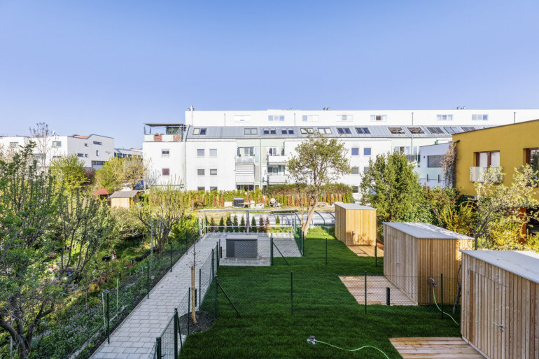1. Liftstock barrierefrei, ca. 57,15 m2, 2 Zimmer: Vorraum, Schlafzimmer, Wohnküche mit Einbauküche und Kochinsel, westseitiger Balkon, Bad mit begehbarer Dusche, Toilette extra, Abstellraum, eigener Garten im Erdgeschoß, Parkettboden, Fußbodenheizung, Luftwärmepumpe, gebrauchter Zustand