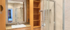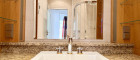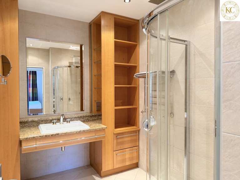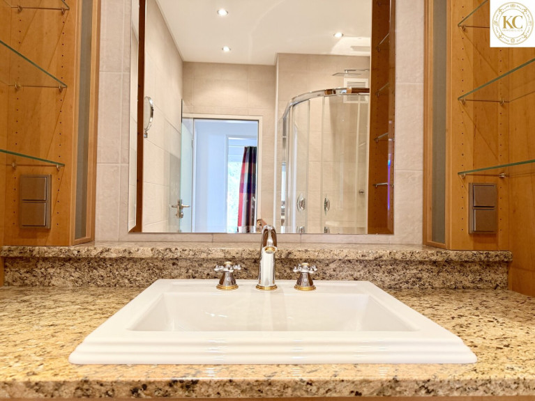 Das Badezimmer überzeugt mit hochwertigen Vollholzmöbeln, edlem Granit und einer großzügigen Dusche.