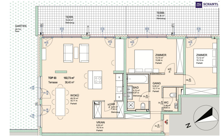 Wohnfläche: ca. 103 m² + Terrasse: ca. 38,40 m² + Garten: ca. 288 m² + Kellerabteil