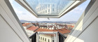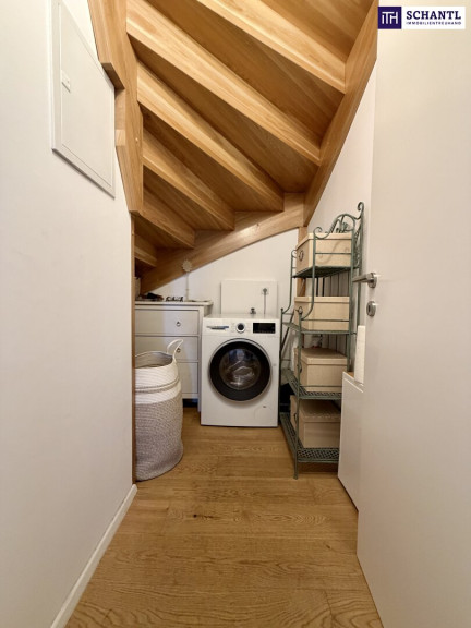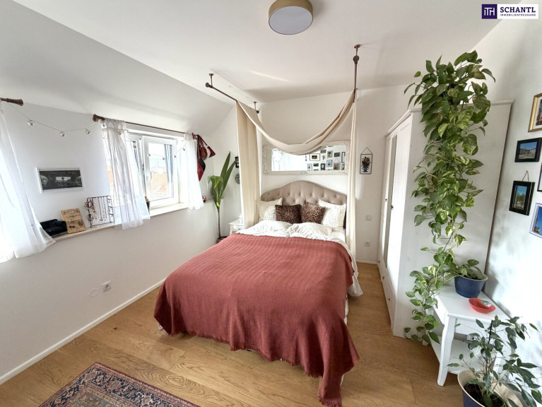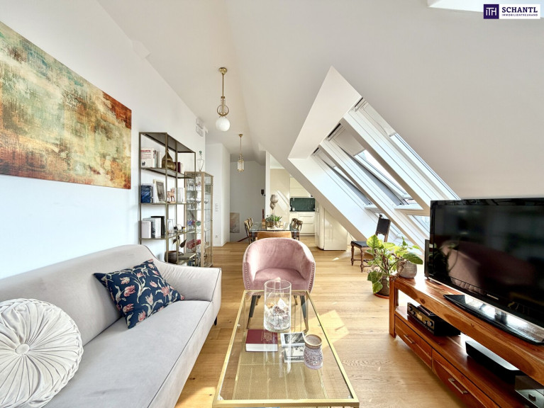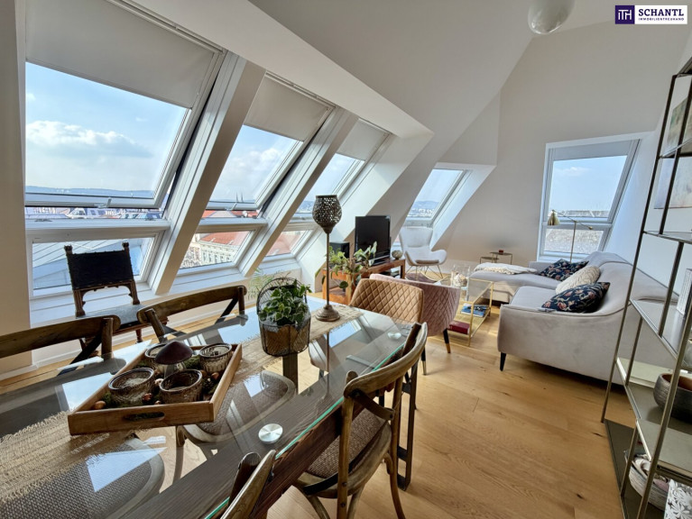 Das absolute Herzstück der Wohnung befindet sich im oberen Geschoss – ein beeindruckender, über 40 m² großer Wohn-, Ess- und Kochbereich mit herrlichem Weitblick Richtung Westen bis zum Kahlenberg. Große Dachflächenfenster durchfluten den Raum mit Licht, ein ausklappbares Balkonfenster sorgt für ein ganz besonderes Wohngefühl.