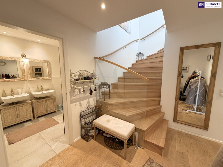 Fußbodenheizung, Klimaanlage auf beiden Ebenen sowie elektrische Außenjalousien (plus zusätzliche Innenjalousien - DG2) sorgen für höchsten Wohnkomfort zu jeder Jahreszeit. Edle Materialien wie Eichenparkett im Landhausstil und stilvolle Fliesen unterstreichen den hochwertigen Charakter dieser Immobilie.