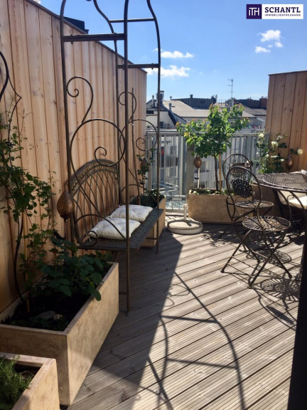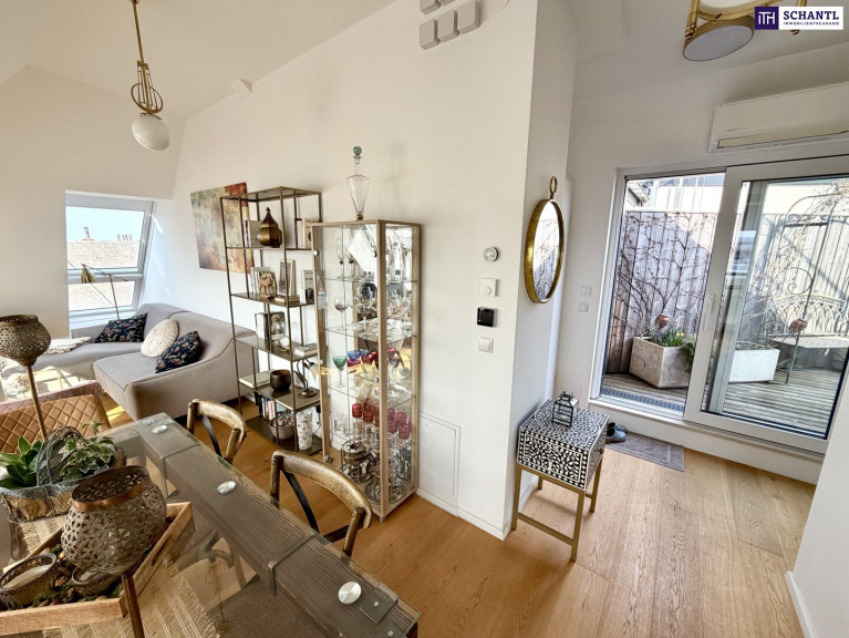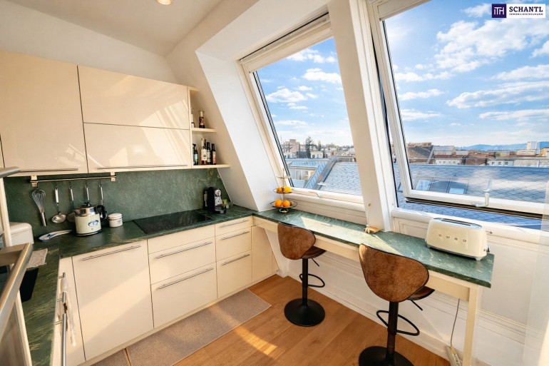 Die hochwertige Küche mit Barbereich lädt zum Verweilen ein und bietet einen einzigartigen Blick über Wien. Die ruhig gelegene, ca. 10,77 m² große Dachterrasse im Innenhof ist nach Osten ausgerichtet, liebevoll begrünt und mit automatischer Bewässerung ausgestattet – ein perfekter Rückzugsort im Freien.