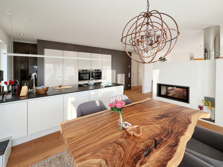 Die ca. 46 m² große Wohnküche wird durch den Kaminofen in den Koch-Ess-Bereich und den Wohnbereich geteilt, wodurch letzterer einen heimeligeren Charakter erhält.