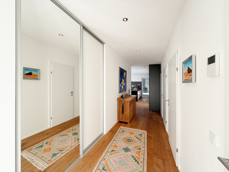 Auch die Garderobe ist hinter zwei raumhohen Schiebetüren perfekt verstaut.