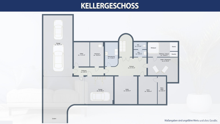 Garage 1: 63,27 m² · Garage 2: 27,49 m² · Kellerraum 22,58 m² · Kellerraum 21,78 m² · Kellerraum 15,96 m² · Kellerraum 14,10 m² · Waschküche 11,52 m² · Heizraum 12,22 m² · Abstellraum 18,64 m² · Abstellraum 3,12 m² · Abstellraum 3,12 m² (Werkstatt · Heizraum · Waschküche · Wellnessbereich mit Sauna, Dampfbadfunktion, Dusche und Whirlpool · Fitnessraum · Party-/Game-Room mit Kamin · Klimatisierter Weinkeller)