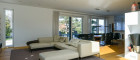 Der Wohnbereich öffnet sich sodann über große Schiebetüren auf zwei Terrassen ins Freie. Die gartenseitige Hauptterrasse mit rund 55 m² erstreckt sich dabei über die gesamte Gebäudebreite. Über drei kleine Stufen gelangt man weiter, zum etwa 7 × 3 m großen und beheizten Pool, der von einer eigenen Sonnenterrasse umgeben ist.