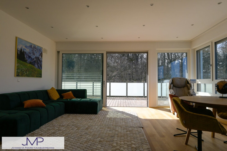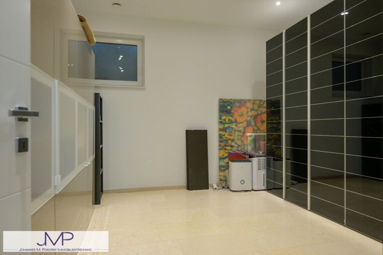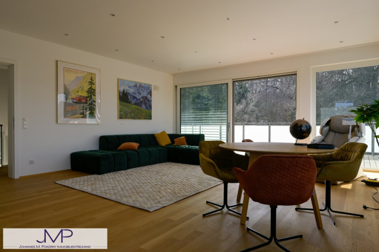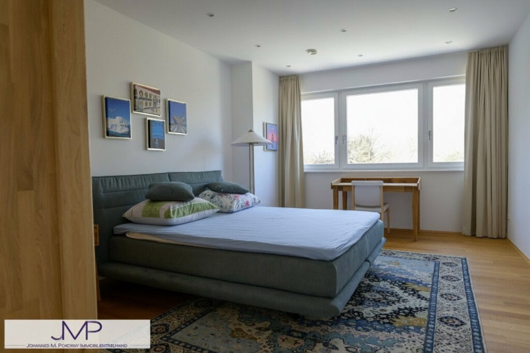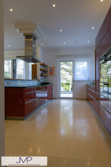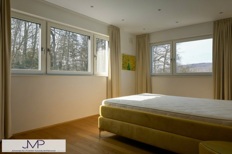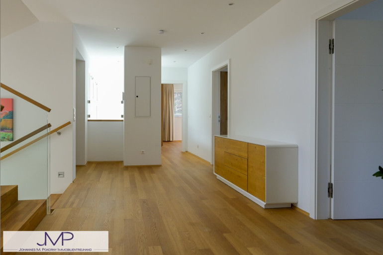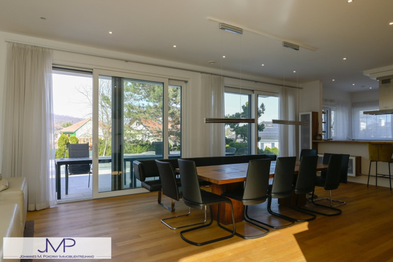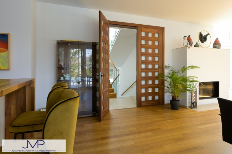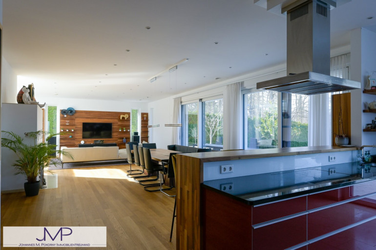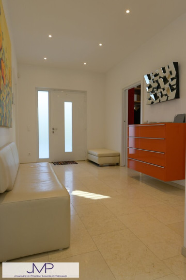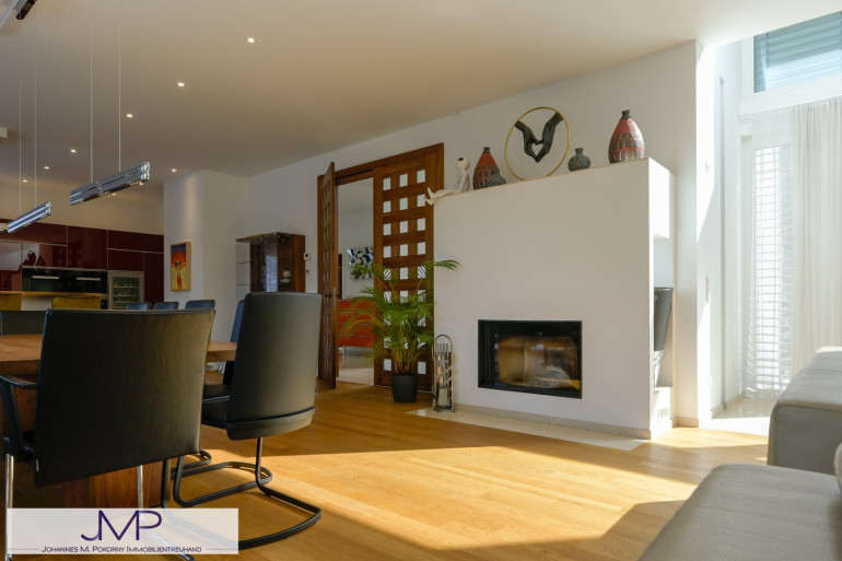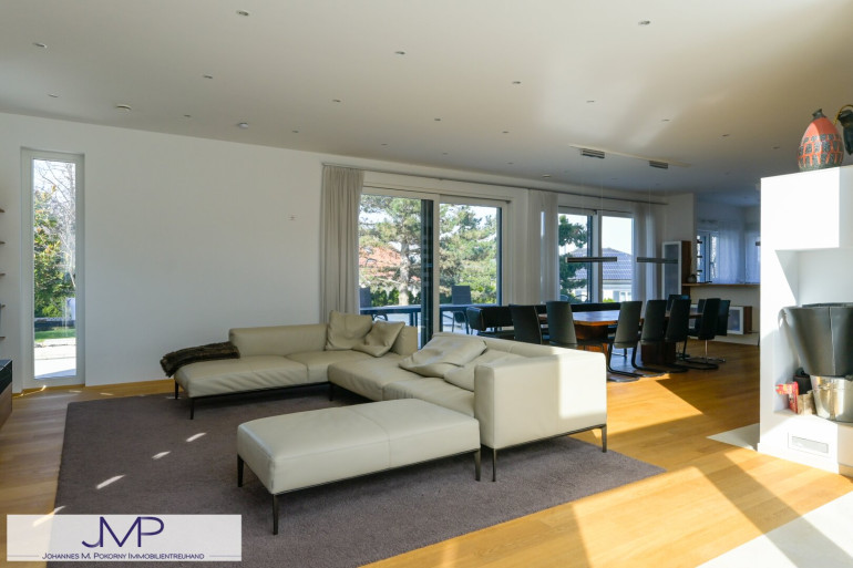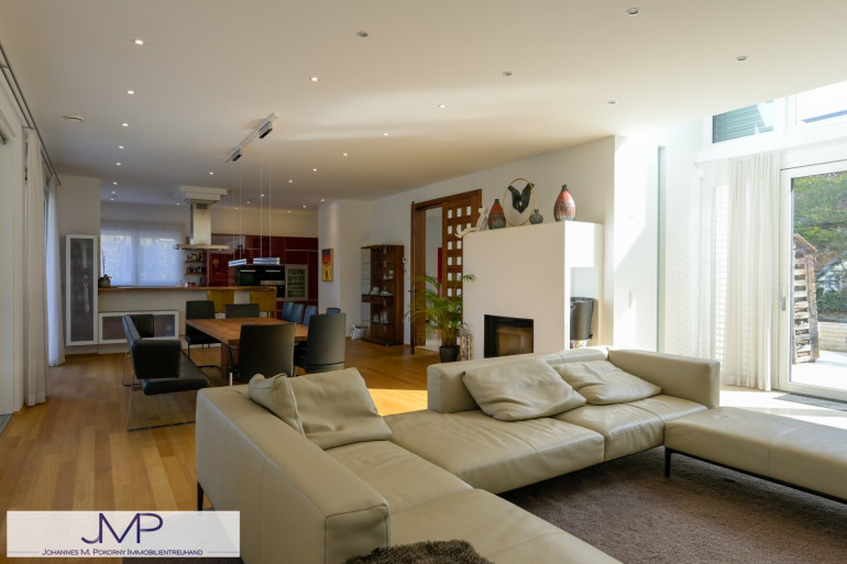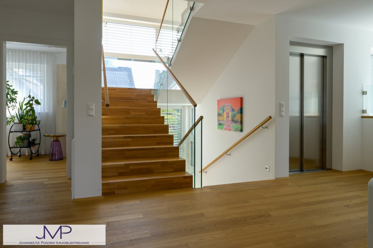 Die großzügige Architektenvilla wurde 2013 als Niedrigenergiehaus errichtet und bietet auf drei Wohnebenen insgesamt sechs großzügige Zimmer mit einer Wohnnutzfläche von rund 365 m². Ein für bis zu acht Personen ausgelegter Lift verbindet dabei komfortabel alle Ebenen – vom Kellergeschoss und der Garage bis ins Dachgeschoss. Dies Gesamtnutzfläche beträgt dabei ca. 530m².