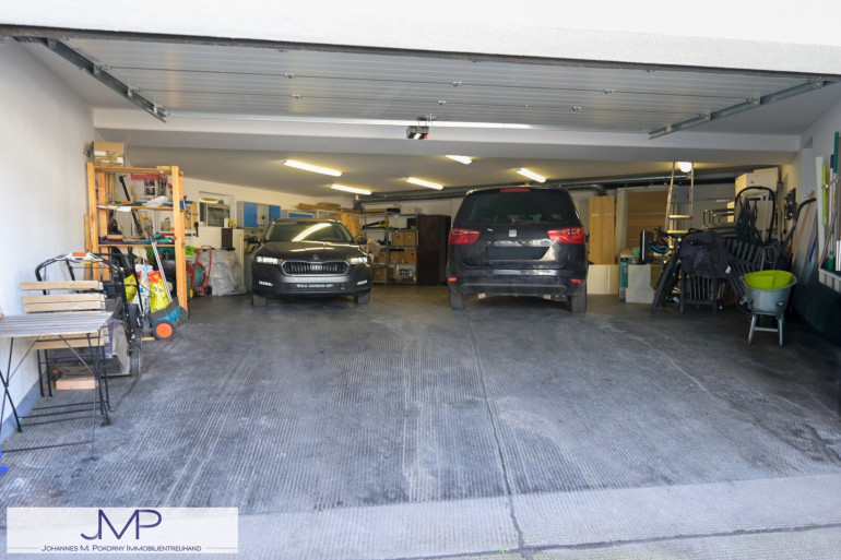 Das hochwertig ausgestattete Kellergeschoss bietet neben drei Abstellräumen viel Stauraum sowie einen geräumigen Wellnessbereich mit Sauna und Dusche. Die rund 121 m² große Garage bietet zudem komfortabel Platz für bis zu drei PKW.