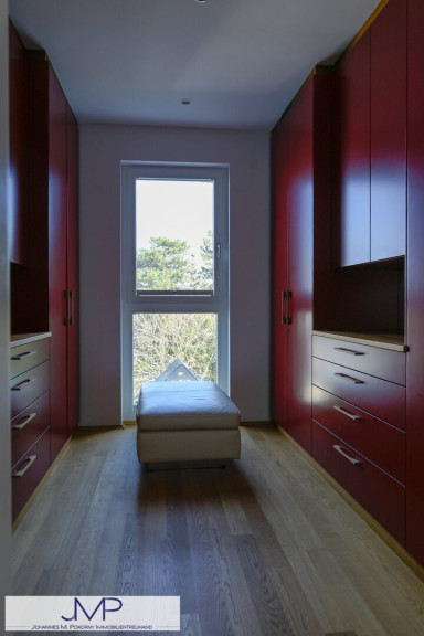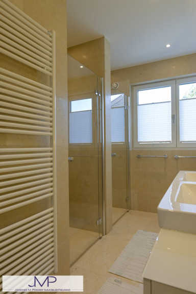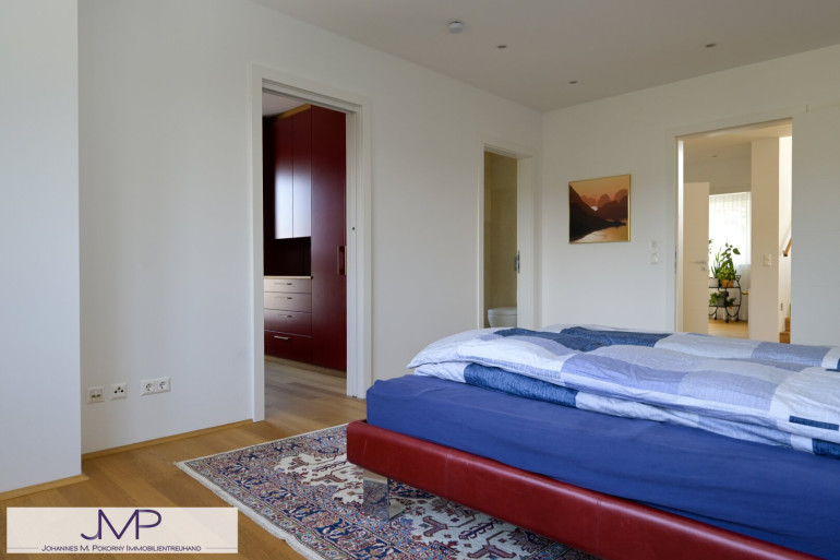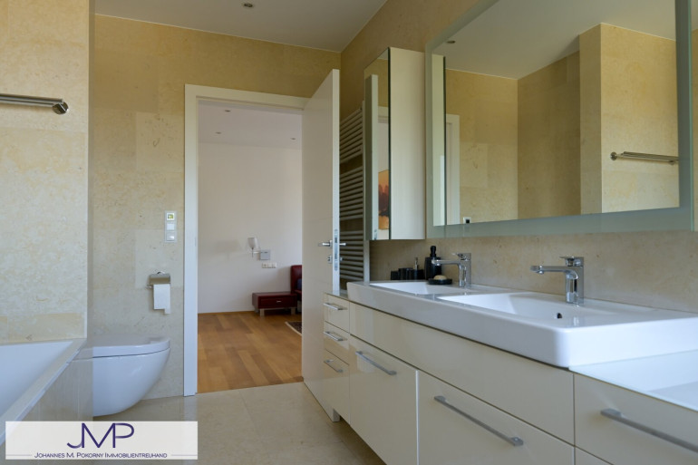 Im Obergeschoss befinden sich drei großzügige Schlafzimmer mit jeweils etwa 20 m², sowie ein Gästezimmer. Das Master-Bedroom verfügt über einen eigenen, rund 9 m² großen Ankleideraum, sowie ein angrenzendes, etwa 10 m² großes Badezimmer mit Fenster, Badewanne, Dusche und einem separatem WC. Ein weiteres Badezimmer mit zwei Duschen ergänzt das Raumangebot auf dieser Ebene.