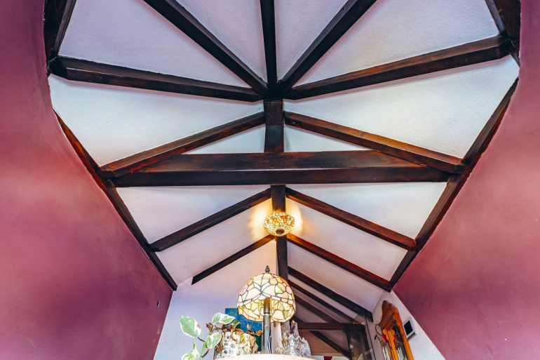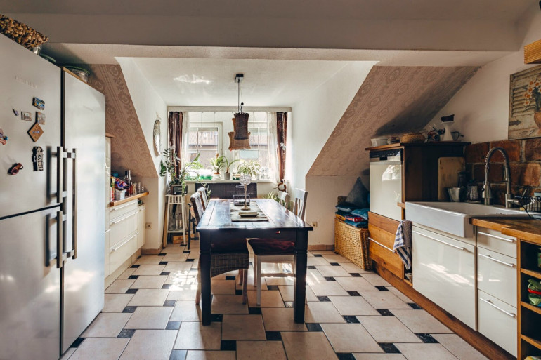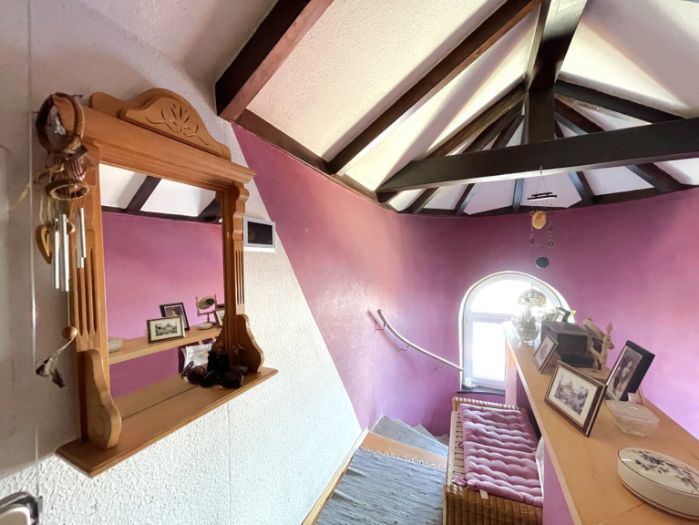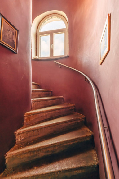 Der Zugang zur Wohnung befindet sich im darunterliegenden Geschoss des Stiegenhauses und führt zunächst in den Vorraum, von dem aus der private Stiegenaufgang zur Dachgeschoss-Wohnfläche beginnt. Von dort gelangt man über einen charaktervollen Stiegenaufgang mit massiven Steinstufen zur Wohnfläche im Dachgeschoss. Sichtbare Holzträger der Dachkonstruktion und ein Rundbogenfenster verleihen diesem Bereich eine besondere Atmosphäre und unterstreichen den individuellen Charakter der Wohnung. Im Dachgeschoss angekommen befindet sich die Wohnfläche mit einer großzügigen Raumaufteilung.