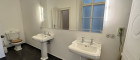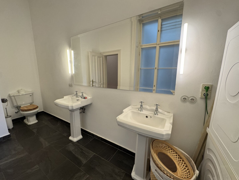 The apartment comprises seven spacious rooms, which can be flexibly used as living areas, bedrooms, offices or guest rooms. The layout is complemented by a fully equipped kitchen and a well-appointed sanitary area. The main bathroom benefits from natural daylight and features a bathtub, a separate shower, a bidet, a double washbasin and a toilet. In addition, there are two separate toilets, each equipped with a washbasin and its own shower.