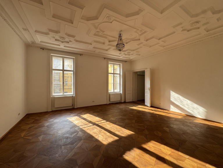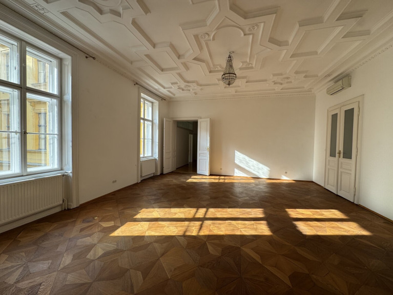 This outstanding apartment is located on the second floor of a prestigious palais building with lift access and represents a high-end residential offering. Situated in the elegant embassy quarter of Vienna’s 4th district, the property enjoys a शांत and refined setting with partial views towards Belvedere Palace and Schwarzenbergplatz. With approximately 323 m2 of usable space, the apartment offers a generous and well-designed layout.