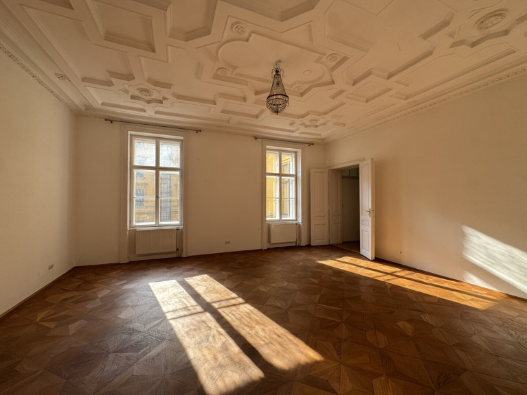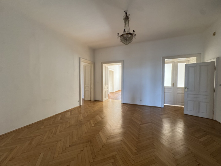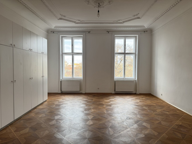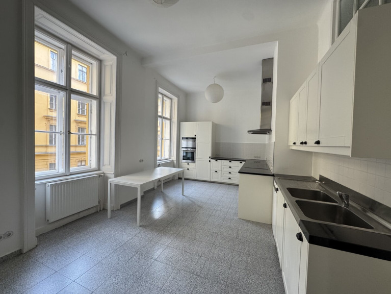 The apartment showcases the charm of classic Viennese period architecture. Elegant star parquet flooring, impressive ceiling heights with decorative stucco details, and large windows create a bright and sophisticated living atmosphere. The kitchen is modern, practical and filled with natural light, offering everything needed for everyday living.
