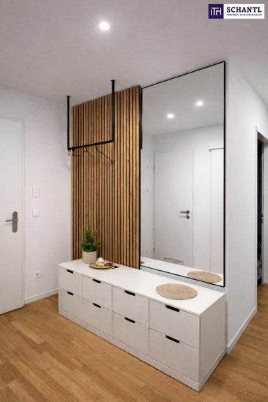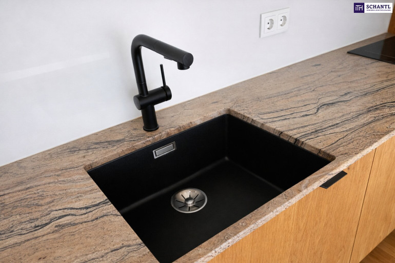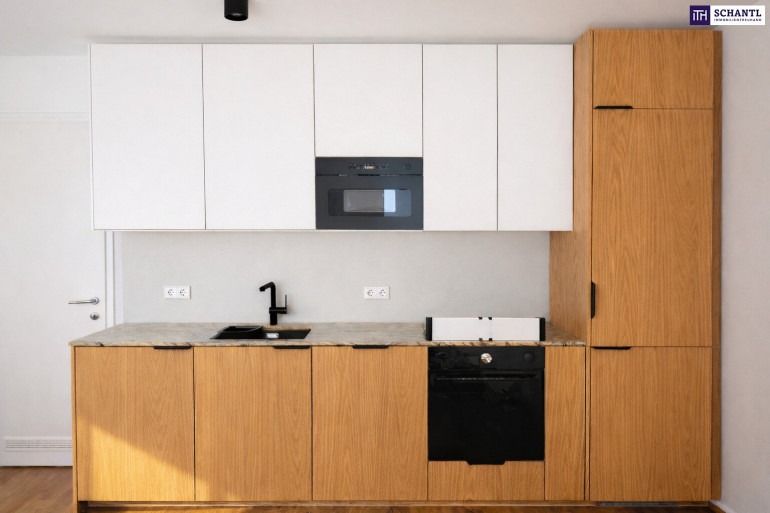 Die Wohnung befindet sich im 2. Stock und überzeugt durch eine besonders effiziente Raumaufteilung. Herzstück ist die großzügige Wohnküche, ausgestattet mit einer Designerküche mit eleganten Holzfronten und hochwertiger Stein-Arbeitsplatte, die modernes Design mit Funktionalität verbindet.