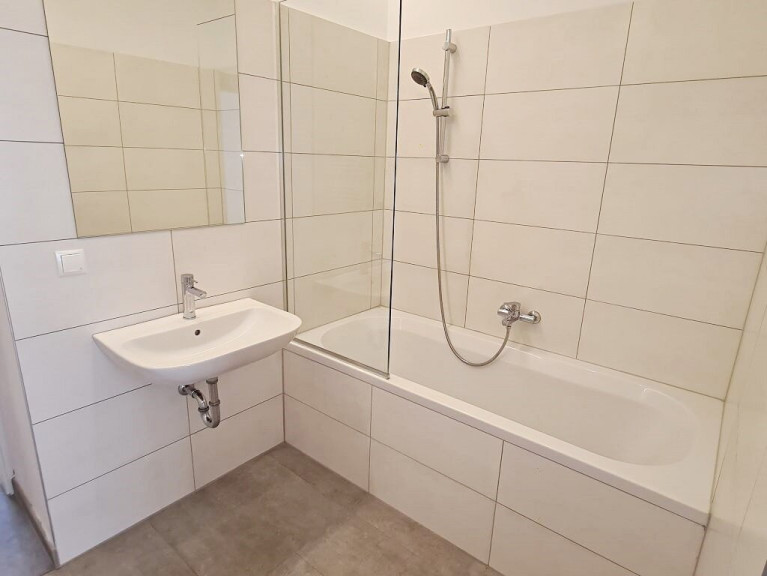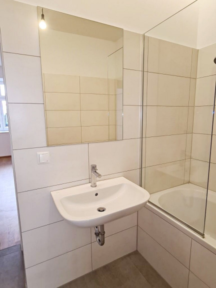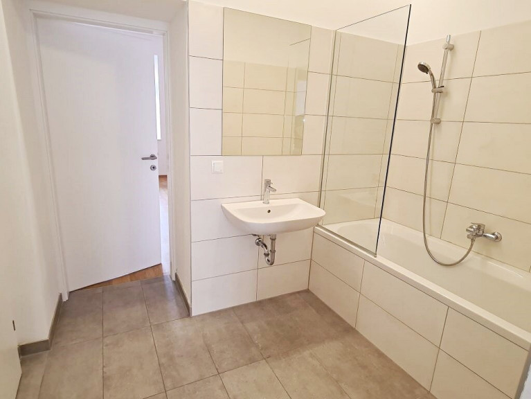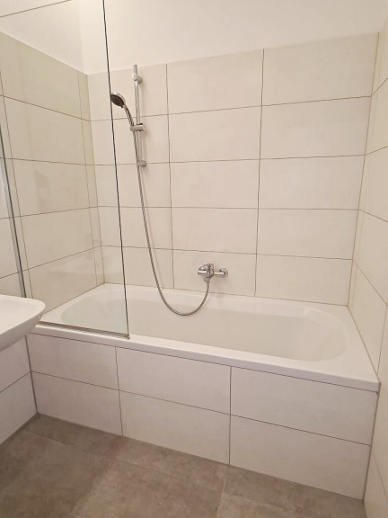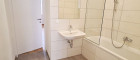 + Badezimmer mit Badewanne, Waschtisch und Waschmaschinenanschluss