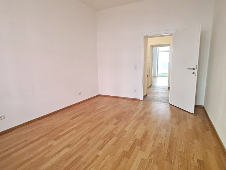 Vorzimmer, Wohn-Esszimmer mit Kochnische, ca. 27 m2 Garten/Terrasse, Badezimmer, separates WC + Kellerabteil