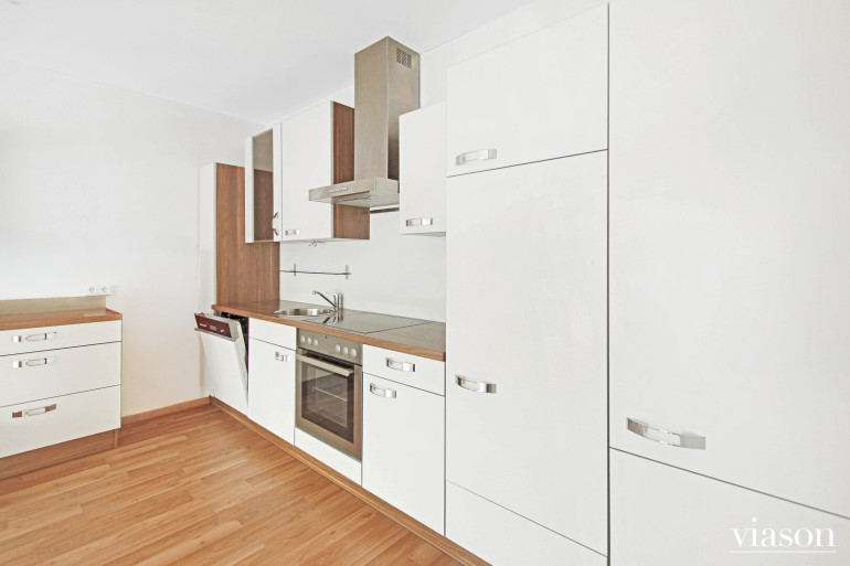 Die Ausstattung umfasst eine komplett eingerichtete Küche mit Ceranfeld, großem Geschirrspüler sowie Kühl- und Gefrierschrank. Zudem sind Rollläden, Laminatböden sowie ein Waschmaschinenanschluss vorhanden.