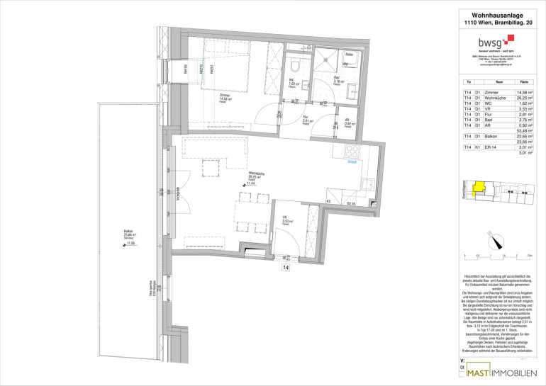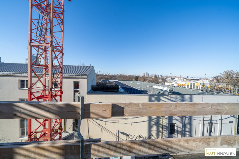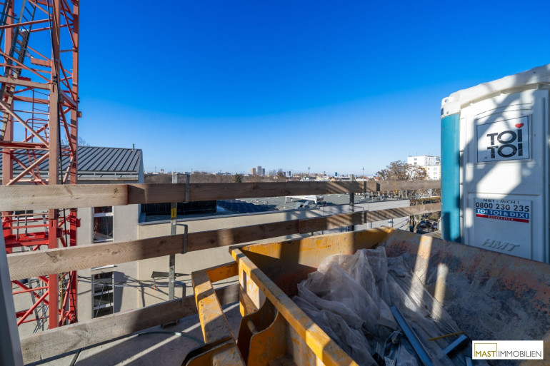 Die Wohnung befindet sich im 4. Liftstock (1. Dachgeschoss) und verfĂĽgt ĂĽber 53,48 m² Wohnfläche + einen 23,66 m²  groĂźen Balkon.Â