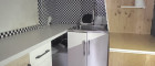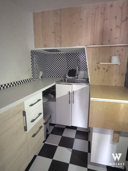 Die Wohnung verfügt über eine kompakte Küchennische mit Spüle und Dunstabzugshaube sowie eine Waschmaschine.