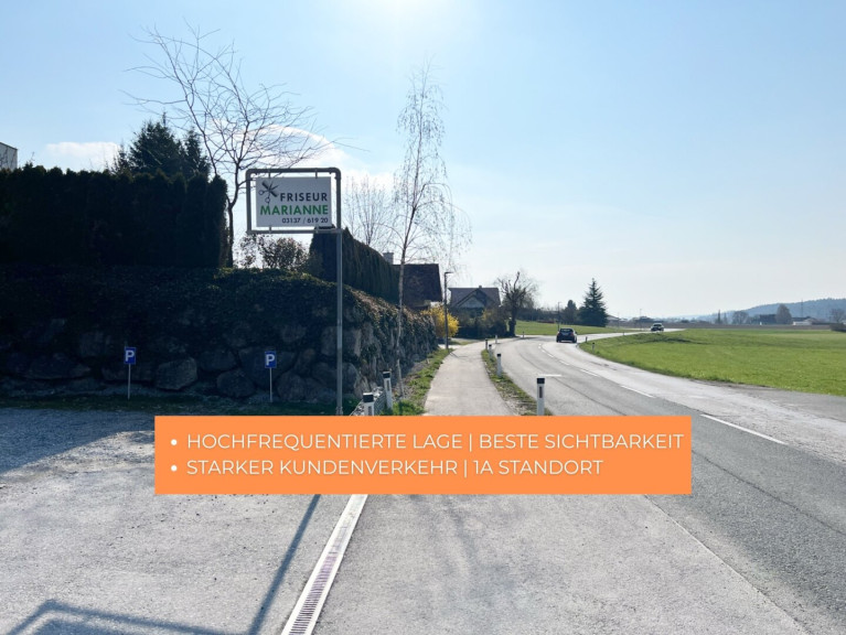 Der Salon befindet sich in sehr gut sichtbarer Lage direkt an der Straße in Hausdorf (Gemeinde Stallhofen) und profitiert täglich von hoher Frequenz – das Geschäft wird von vielen Menschen beim Vorbeifahren wahrgenommen. Die Autobahnauffahrt Mooskirchen-Söding ist nur wenige Minuten entfernt und sorgt zusätzlich für eine ausgezeichnete Erreichbarkeit.