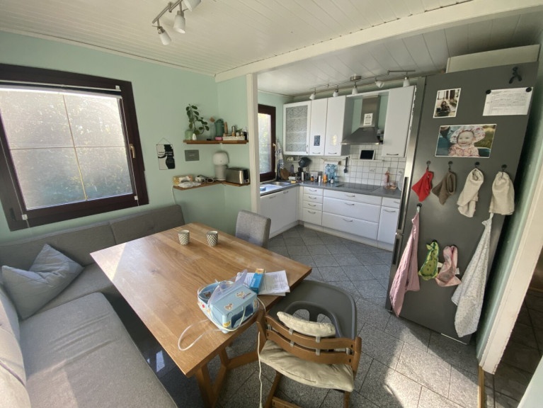 Estrichboden, Fliesen, Laminatboden, Kamin, Zentralheizung, Einbauküche, Ostbalkon, Südbalkon, Bad mit Fenster, Badewanne, Dusche, Garage, Parkplatz