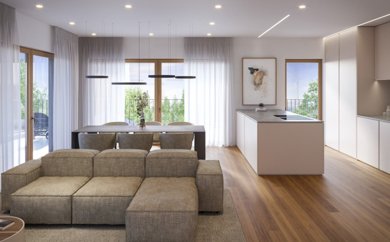 Offenes, großzügiges Wohnen mit direktem Zugang zum Balkon – perfekt für gesellige Abende und ein modernes Wohnambiente.