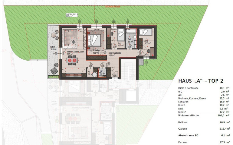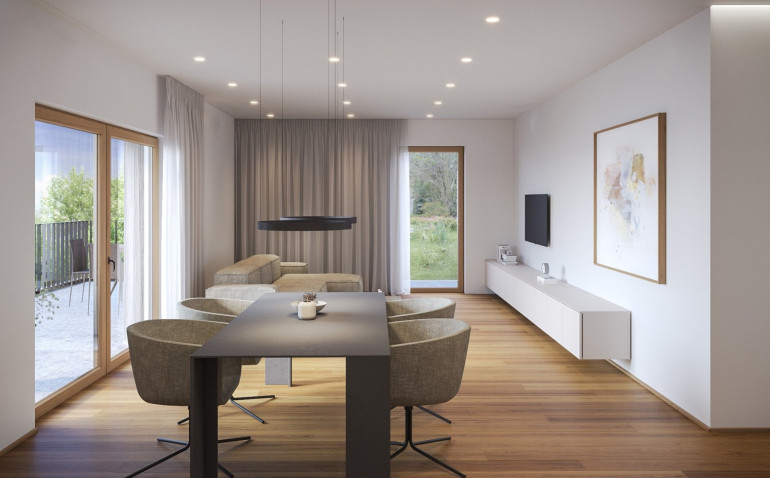 Haus A – Top 1 überzeugt mit einer durchdachten Raumaufteilung, hochwertigen Ausstattungsdetails und einem besonders großzügigen Eigengarten.