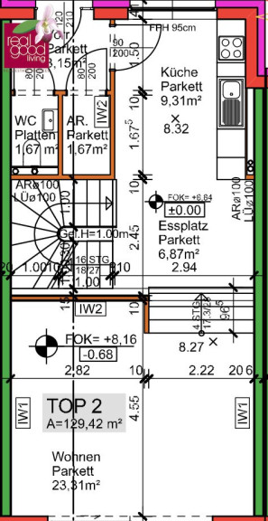 Die angeführten Flächen ergeben rund 154,85 m² Wohnnutzfläche ohne Kellergeschoss, ca. 61,20 m² Kellergeschoss sowie insgesamt ca. 29,03 m² Balkon- und Terrassenflächen.