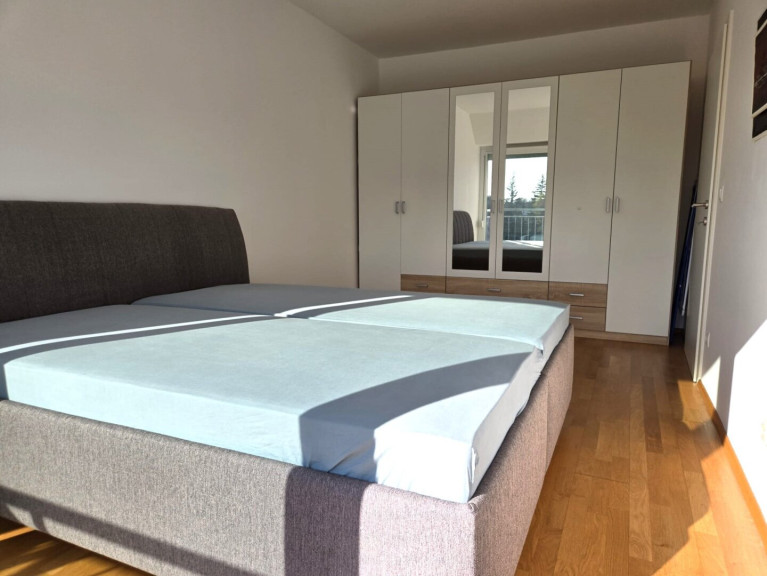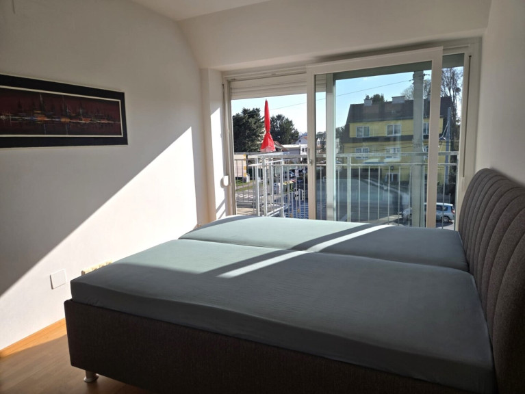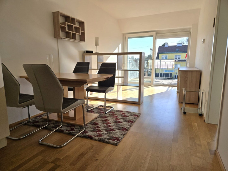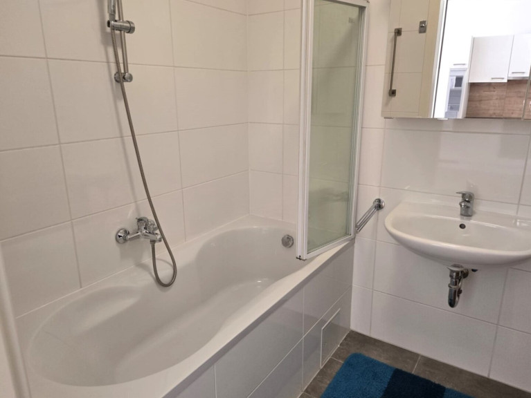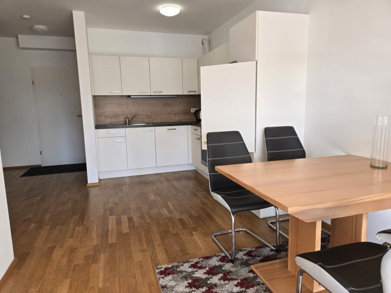 Wohnzimmer als auch Schlafzimmer sind mit Echtholzparkett und großen Schiebetüren ausgestattet und von beiden Zimmern gelangt man auch auf die große südwest-ausgerichtete Terrasse. Außenrolläden sorgen für vollkommene Beschattung und Verdunkelungsmöglichkeiten. Die vollwertige Küche ist mit einem Ceranfeld, Geschirrspüler, Backrohr, Dunstabzug und einer Kühl-Gefrierkombi ausgestattet. Alle Geräte sind neuwertig! Das Badezimmer ist mit einer Wanne, einem Waschbecken und Waschmaschinenanschluss ausgestattet. Ein praktisches, separates Kellerabteil gehört ebenfalls zur Wohnung.
