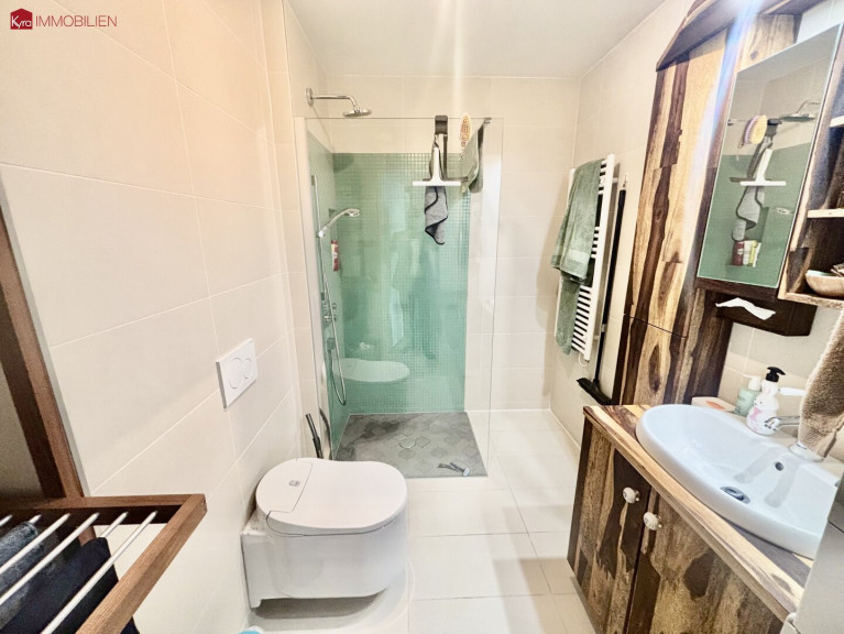 Die moderne Einbauküche (Tischler Küche) ist funktional und stilvoll gestaltet, ideal für Hobbyköche und Genießer. Das Badezimmer ist mit einer eleganten bodengleichen Dusche (Villeroy und Boch Fliesen) und einem modernen Dusch-WC ausgestattet und fügt sich harmonisch in das Gesamtbild der Wohnung ein. Als besonderes Highlight steht Ihnen ein Rooftop-Pool mit Skyline-Feeling zur Verfügung, der Erholung und Freizeitspaß direkt im Haus ermöglicht.