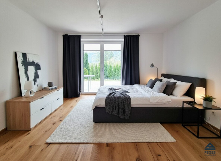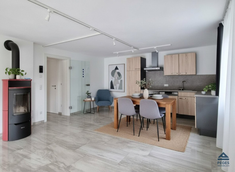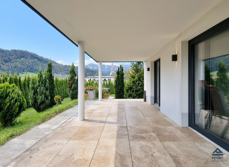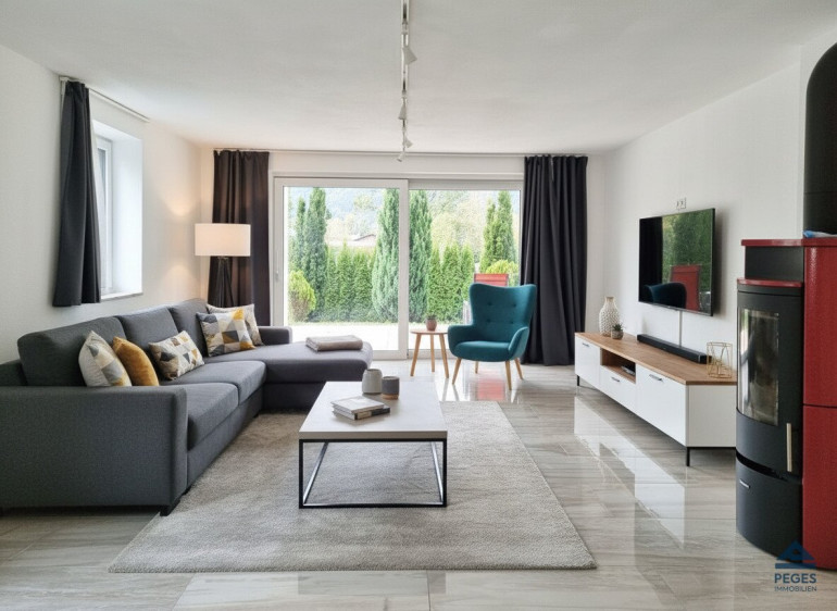 Die Wohnung mit einer Wohnfläche von ca. 65 m² zzgl. Terrasse mit ca. 27 m² und Süd-West-Ausrichtung befindet sich im Erdgeschoss eines im Jahr 2016 komplett sanierten Wohnhauses mit nur 2 Wohneinheiten. Neben der herrlichen Lage besticht diese Wohnung vor allem durch eine gut durchdachte Raumaufteilung. Über den attraktiv gestalteten Eingangsbereich gelangt man in die mit eleganten Bodenbelägen ausgestatteten Wohnräumlichkeiten. Das geräumige Wohnzimmer, das mit einer modernen Einbauküchenzeile (inkl. Geräten und Anschlussmöglichkeit für Geschirrspüler) ausgestattet ist, bietet viel Platz und ist aufgrund der schönen Panoramaverglasung, die den Blick auf die umgebende Berglandschaft eröffnet, hell und lichtdurchflutet. Hier sorgt zudem ein Kaminofen (Holz) für wohlige Wärme und gemütliche Atmosphäre. Die großzügige, sonnige Terrasse mit ca. 27 m² und südwestlicher Ausrichtung ist perfekt geschnitten und bietet einen großartigen Ausblick. Das Schlafzimmer ist, wie auch das Wohnzimmer, vom Vorraum aus begehbar und angenehm hell. Modern und elegant präsentiert sich auch das mit einer Dusche und schönem Fliesenbelag ausgestattete taghelle Badezimmer. Ein eigener Waschmaschinen-Anschluss ist im Keller vorhanden. Für ausreichend Stauraum sorgt ein großzügiger Abstellbereich mit ca. 80 m² im Dachboden.