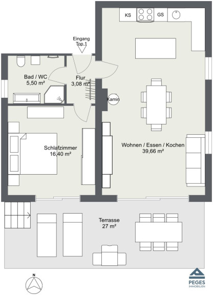 Räumliche Aufteilung: Vorraum, Bad (mit Dusche) / WC, Wohnzimmer mit Küchenzeile (samt Geräten), Schlafzimmer; Terrasse, Abstellbereich im Dachboden, 1 Garagen-Stellplatz