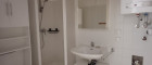 Badezimmer mit Dusche und WC, Waschbecken, Spielgelschrank, Waschmaschinenanschluss