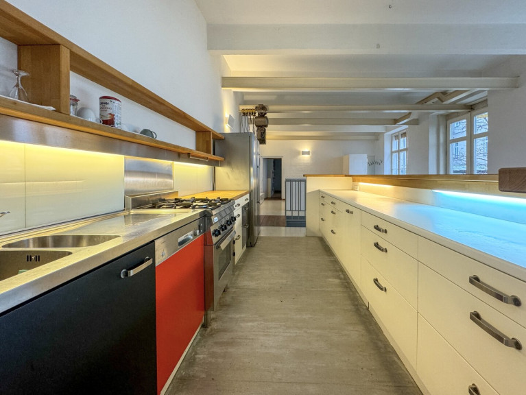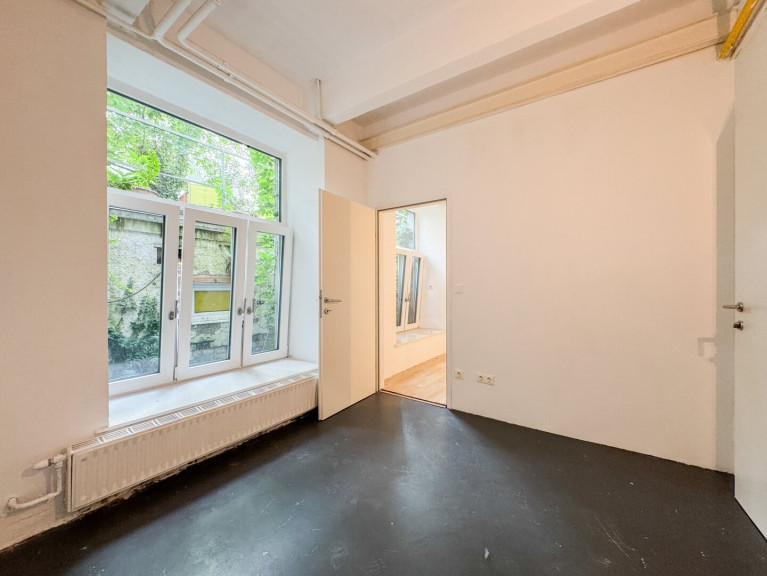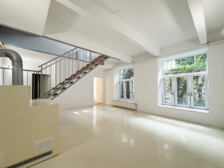 Zum Verkauf steht ein einzigartiges Loft, eine ehemalige Niederlassung der Firma Kodak. Beim Ausbau des Lofts wurde darauf geachtet den Industriestil beizubehalten und so für einen außergewöhnlichen Charme zu sorgen. Es liegt im Hof eines schönen Jugendstilaltbaus, welcher 1913 errichtet wurde, in absoluter Ruhelage. Die Wohnung erstreckt sich, auf zwei Etagen (Erdgeschoss und Souterrain), über ca. 212 m² und ist über drei separate Eingänge begehbar. Benutzt man den Haupteingang über den Hof, gelangt man auf direktem Weg ins großzügige Wohnzimmer mit offener Küche. Über den gesamten Raum erstrecken sich große Fenster, welche für ein außergewöhnlich helles Ambiente sorgen. Ein Schlafzimmer befindet sich ebenfalls im Erdgeschoss des Lofts. Es verfügt über ein Badezimmer mit Dusche, einen eigenen Eingang vom Stiegenhaus und Anschlüsse für eine Küche. Im Erdgeschoss wird über Radiatoren geheizt.
