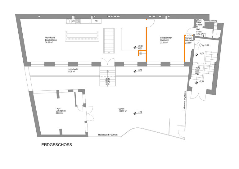 Zusätzlich gibt es noch einen etwa 100 m² großen sonnigen Innenhof, ein 30 m² großes Lager und einen 13 m² großen Keller.