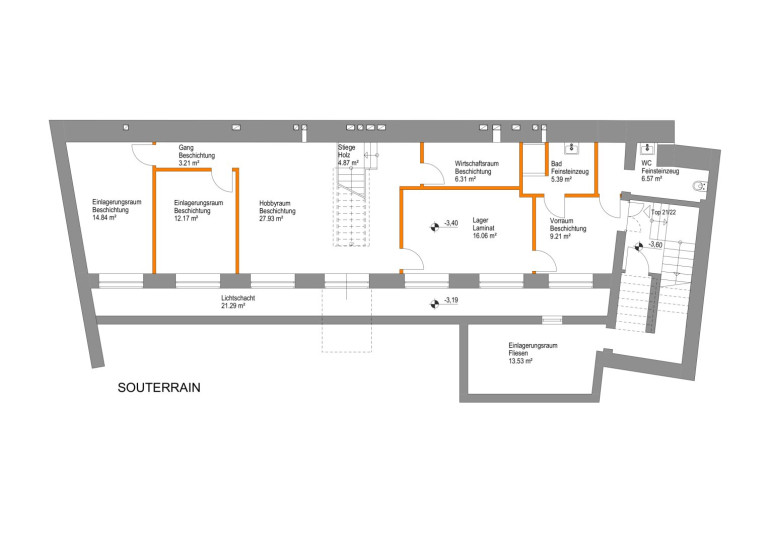 Das Souterrain ist aufgrund der großen Fenster und des breiten Lichthofs sehr hell und bietet im Sommer einen kühlen Rückzugsort. Es verfügt über drei separate Zimmer, einen Hauswirtschaftsraum, ein Bad und ein WC, welche über Fußbodenheizung gewärmt werden. Zu diesem Bereich der Wohnung gibt es ebenfalls einen separaten Zugang, sodass auch dieser unabhängig genutzt werden kann.