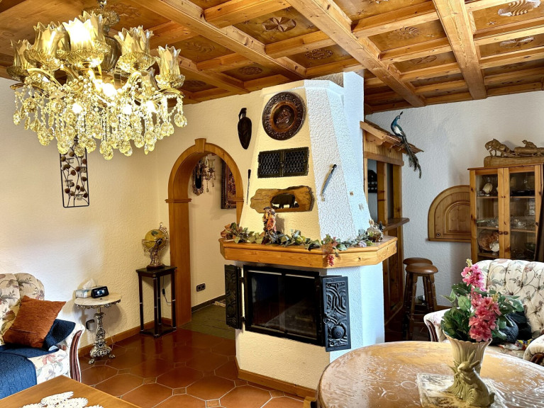 Fliesen, Parkett, Heizofen, Kamin, Einbauküche, Südbalkon, Bad mit Fenster, Badewanne, Dusche, Carport, Parkplatz, Wasch/Trockenraum