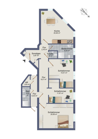 - Eingangsbereich: Flur mit zwei praktischen Nischen für Garderobe oder Abstellfläche.